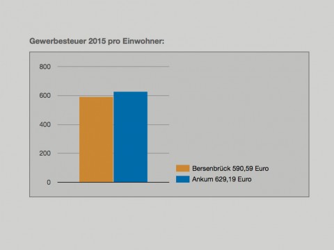 Ankum liegt beim Gewerbesteueraufkommen pro Einwohner vor Bersenbrück: Das wird manchen – angesichts der großen Bersenbrücker Gewerbegebiete – überraschen. Erhoben wurden die Zahlen zum 02.12.2015. Danach legte Ankum beim Gewerbesteueraufkommen um 22,25 % zu, Bersenbrück um 13,11 %.