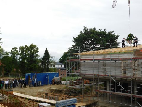 Seit Freitagmittag, 18. August, signalisiert die Richtkrone, dass es in Ankum an der Schulstraße Grund zu feiern gab: Die Vollendung des Rohbaus der neuen Kita „Im Dorfe“.