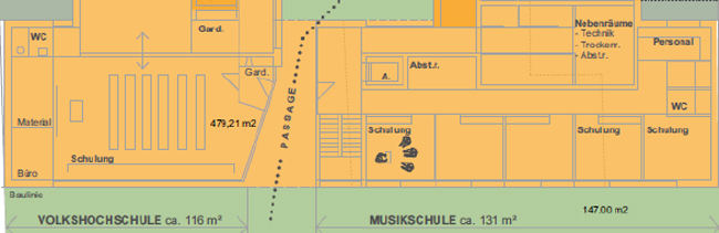 Im Erdgeschoss: Vorne, zur Bramscher Straße, Musikschule und Volkshochschule. Nach hinten: Gemeinschaftsbereich und Wohnungen für Menschen mit Behinderungen.