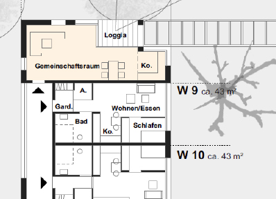 - Durch einen großzügigen Gemeinschaftsbereich im Erdgeschoss sind gemeinsame Aktivitäten und Veranstaltungen von Senioren und Menschen mit Beeinträchtigungen möglich.