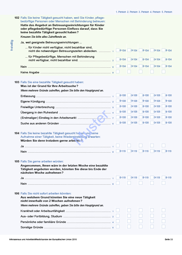 Eine Seite aus „Stichprobenerhebung über die Bevölkerung und den Arbeitsmarkt Mikrozensus 2015 und Arbeitskräftestichprobe 2015 der Europäischen Union“